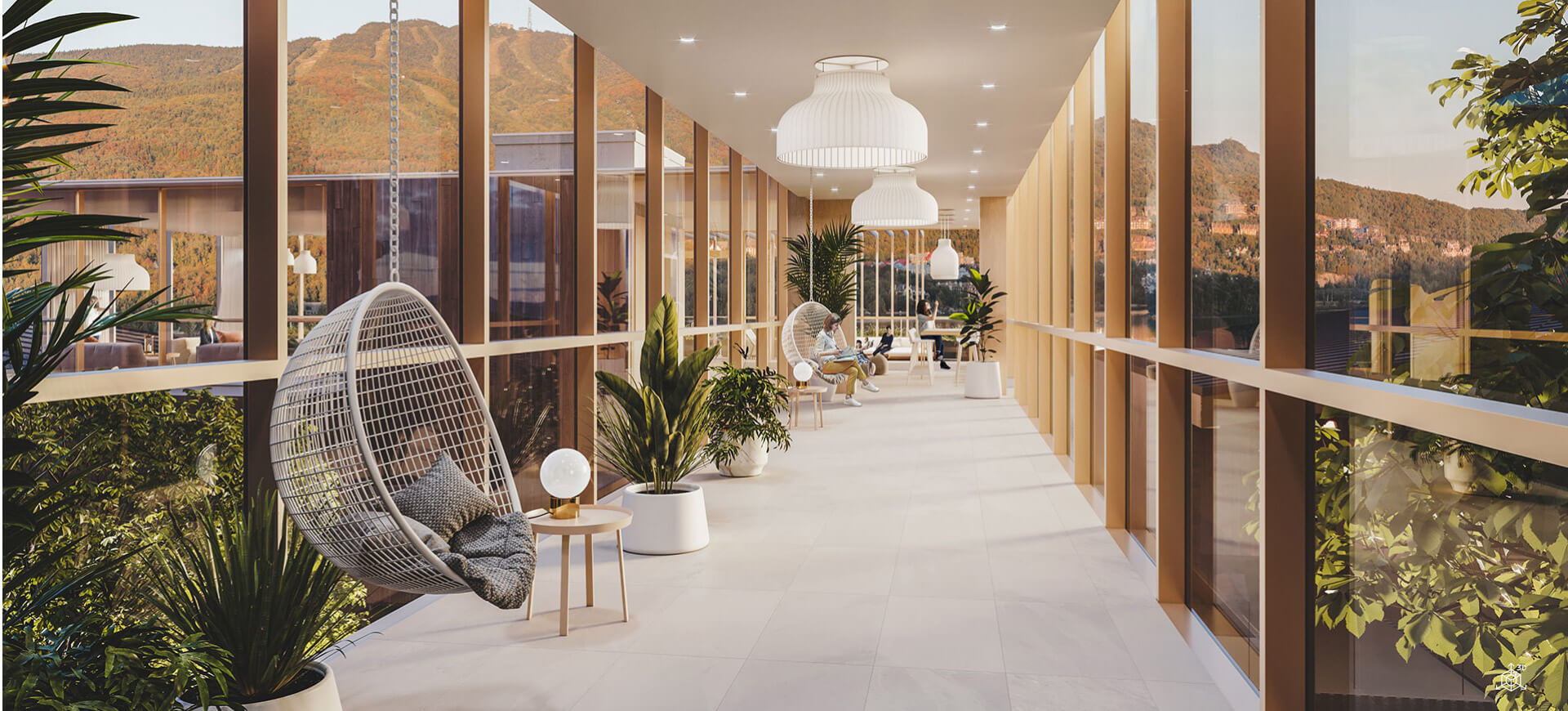 Pour vous immerger dans le paysage, la magnifique passerelle vitrée relie l’ensemble des pavillons. Véritable belvédère et élément fédérateur de LAGO, son rôle est de faire vivre et cohabiter les occupants dans un environnement exclusif conçu pour rehausser votre mode de vie.